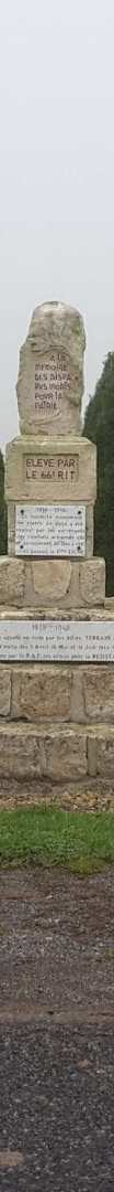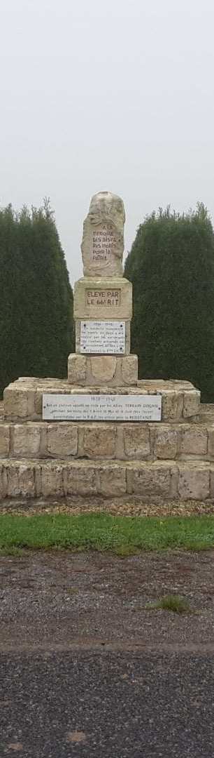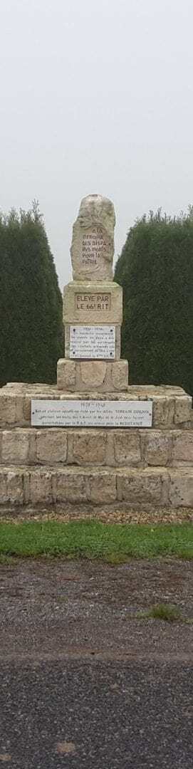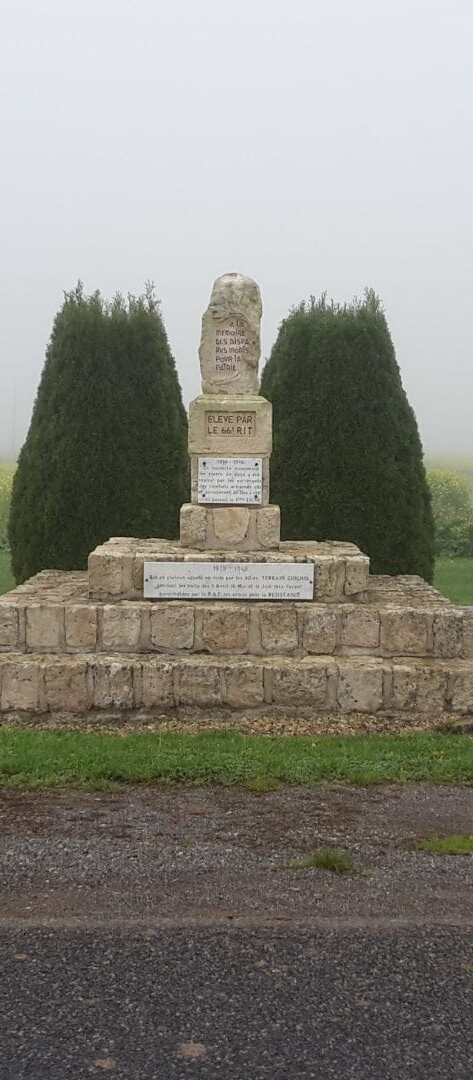 Monument rénové au printemps 2014 – « A la mémoire des disparus morts pour la Patrie . Élevé par le 66 R.I.T. – 1914-1918 Ce modeste monument en pierre du pays a été érigé par les survivants des combats acharnés qui ce déroulèrent de 1914 à 1917 Ici ou passait la 1ère ligne – 1939 -1945 Sur ce plateau surnommé en code par les Alliés TERRAIN GUIGNOL. Pendant les nuits des 5 avril, 10 mai et 12 juin 1944 furent parachutés par la R.A.F. les armes pour la Résistance »